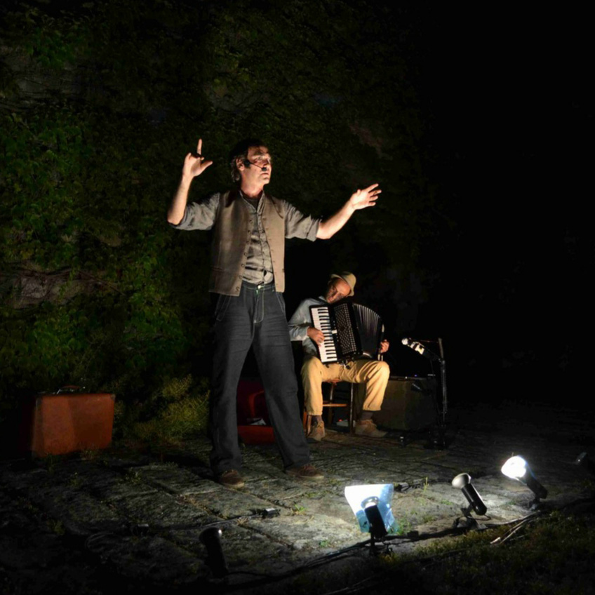 Sinossi: Come ritrovare le impronte del cammino degli antenati, che dalle caverne-templi dell’arte giungeva sino al cuore di una realtà in cui vivere era accordarsi tra terra e cielo, tra sudore e stupore? Non è possibile: ogni traccia è ormai scomparsa. Solo i bambini, gli insonni in attesa di un nuovo sole, i naufraghi alla deriva tra le onde di un amore che parrebbe sepolto nei fondali, i disarmati per scelta consapevole e i non credenti nel culto dell’apparenza, possono ancora sognarle cosi intensamente da farne sorgere di nuove. Un possibile futuro cammino, una nuova nascita, un sorriso. Offrire tale visione è il senso di questo spettacolo in cui la triade di musica, canto e narrazione poetica divengono arte evocativa tra panorami bellici, piogge acide e credenze ottuse che temono la loro origine. Eppure, i futuri antenati sono già presenti nel suono e nel respiro dello spettacolo, come una pioggia di petali che accompagna chi non smette di guardare lontano ed esce nel mondo senza ombrelli e ombre.